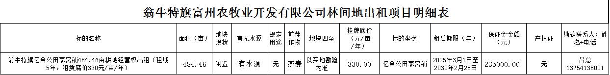 484.46畝土地經(jīng)營權(quán)出租,位于翁牛特旗億合公鎮(zhèn)田家窩鋪村,租賃期限自2025年3月1日起至2030年2月28日