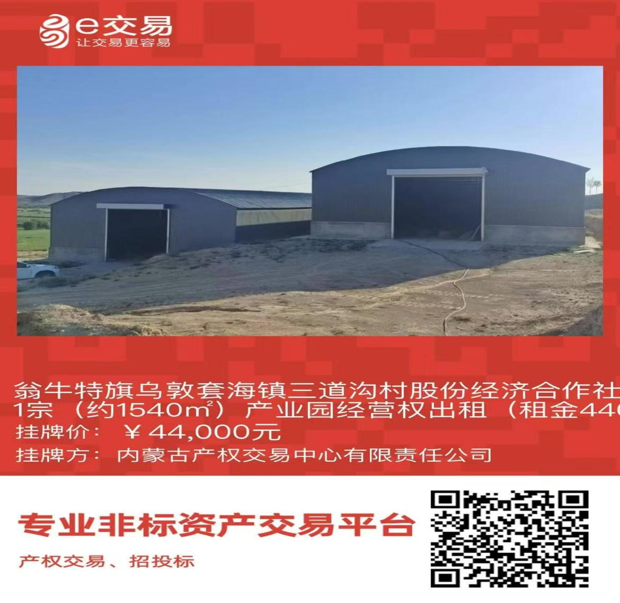 翁牛特旗烏敦套海鎮(zhèn)三道溝村股份經(jīng)濟合作社1宗(約1540㎡)產(chǎn)業(yè)園經(jīng)營權(quán)出租(租金44000元/年,租期5年)