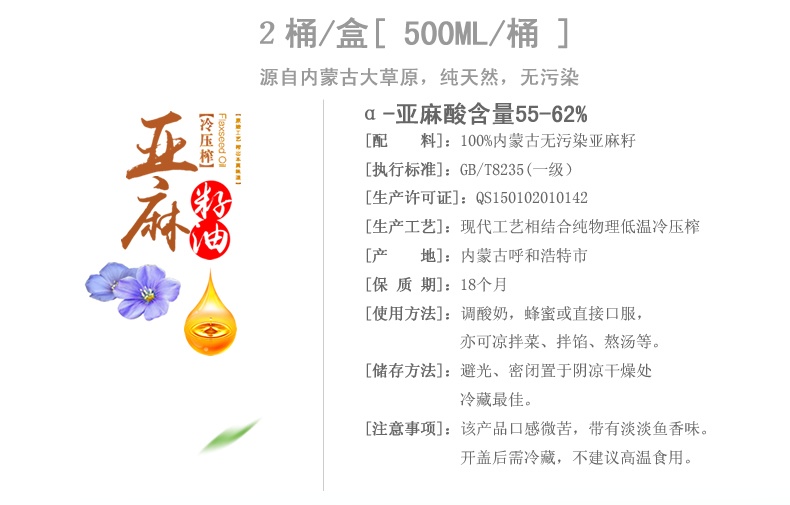 產(chǎn)品名稱:禮盒裝亞麻籽油 金谷金牧冷榨亞麻籽油 食用亞麻籽油 批發(fā)特價(jià)
