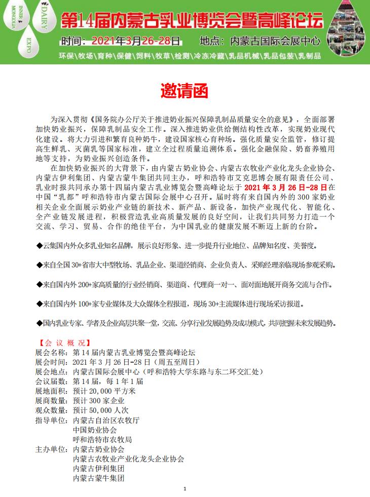 第14屆內(nèi)蒙古乳業(yè)博覽會暨高峰論壇邀請函