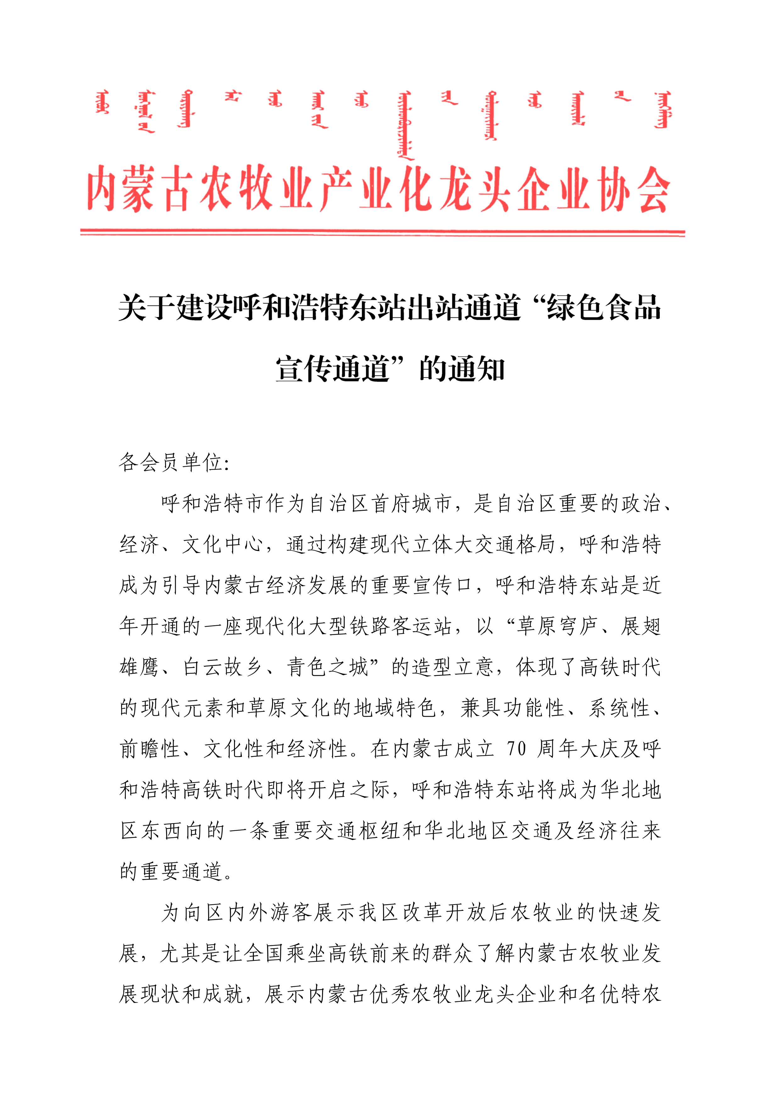 關(guān)于建設(shè)呼和浩特市東站出站通道“綠色食品宣傳通道”的通知