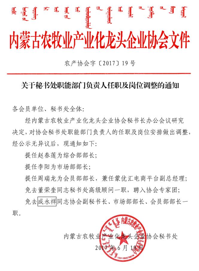 關(guān)于秘書處職能部門負(fù)責(zé)人任職及崗位調(diào)整的通知