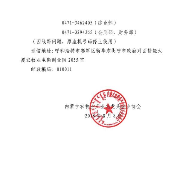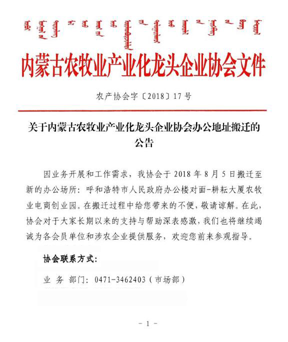關(guān)于內(nèi)蒙古農(nóng)牧業(yè)產(chǎn)業(yè)化龍頭企業(yè)協(xié)會辦公地址搬遷的公告