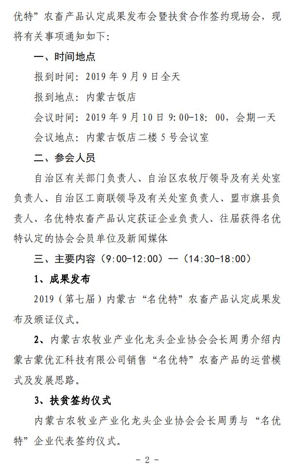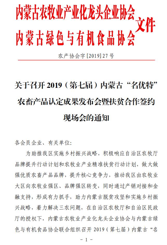關(guān)于召開(kāi) 2019(第七屆)內(nèi)蒙古“名優(yōu)特” 農(nóng)畜產(chǎn)品認(rèn)定成果發(fā)布會(huì)暨扶貧合作簽約 現(xiàn)場(chǎng)會(huì)的通知