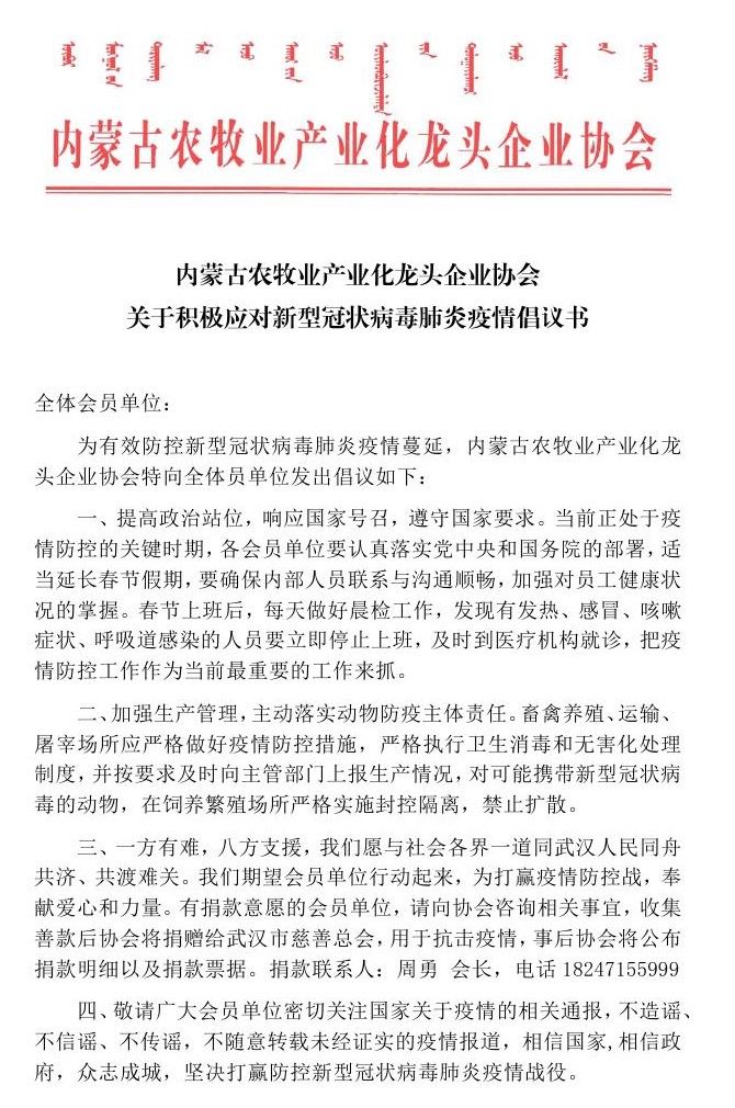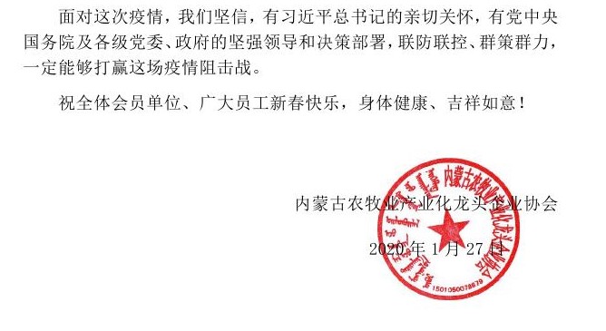 內蒙古農牧業(yè)產業(yè)化龍頭企業(yè)協(xié)會關于積極應對新型冠狀病毒肺炎疫情倡議書
