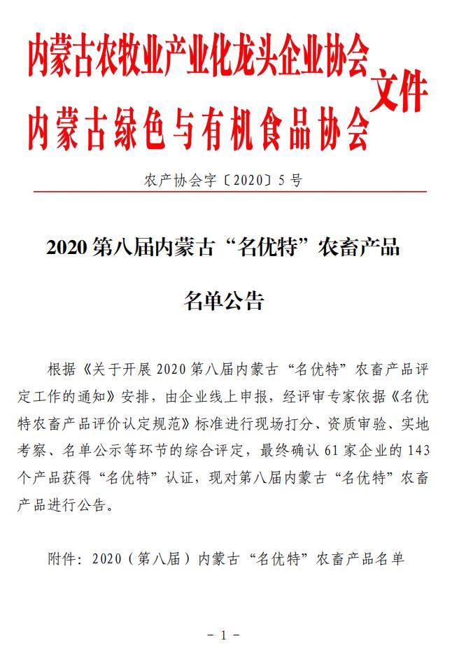 2020第八屆內蒙古“名優(yōu)特”農(nóng)畜產(chǎn)品名單公告