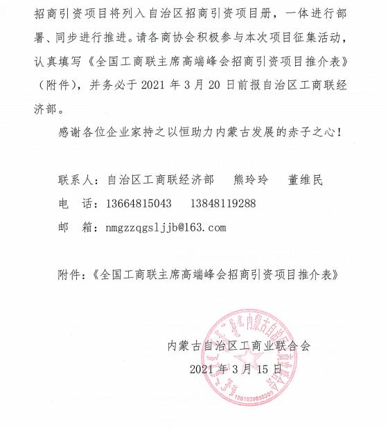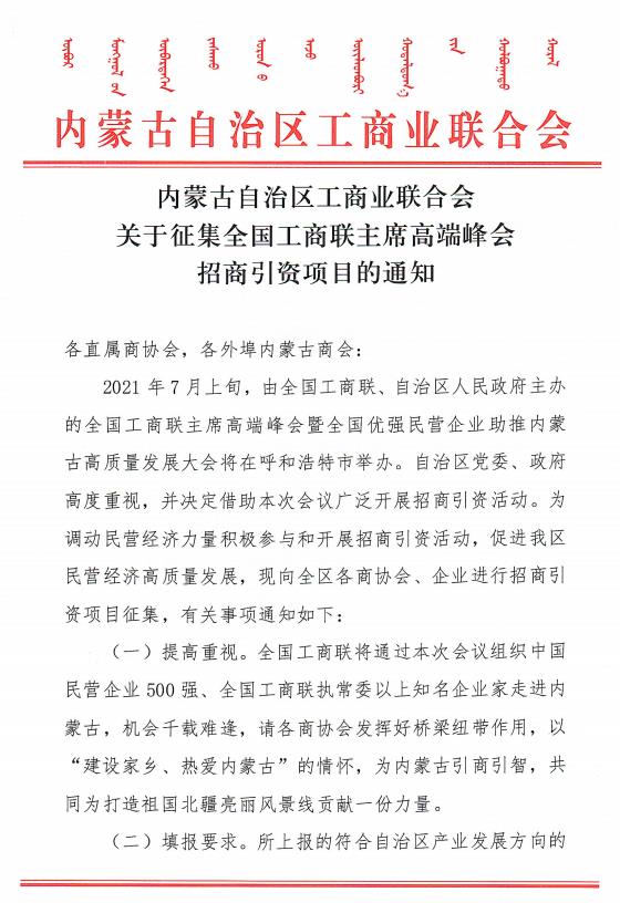 內(nèi)蒙古自治區(qū)工商業(yè)聯(lián)合會關(guān)于征集全國工商聯(lián)主席高端峰會招商引資項(xiàng)目的通知