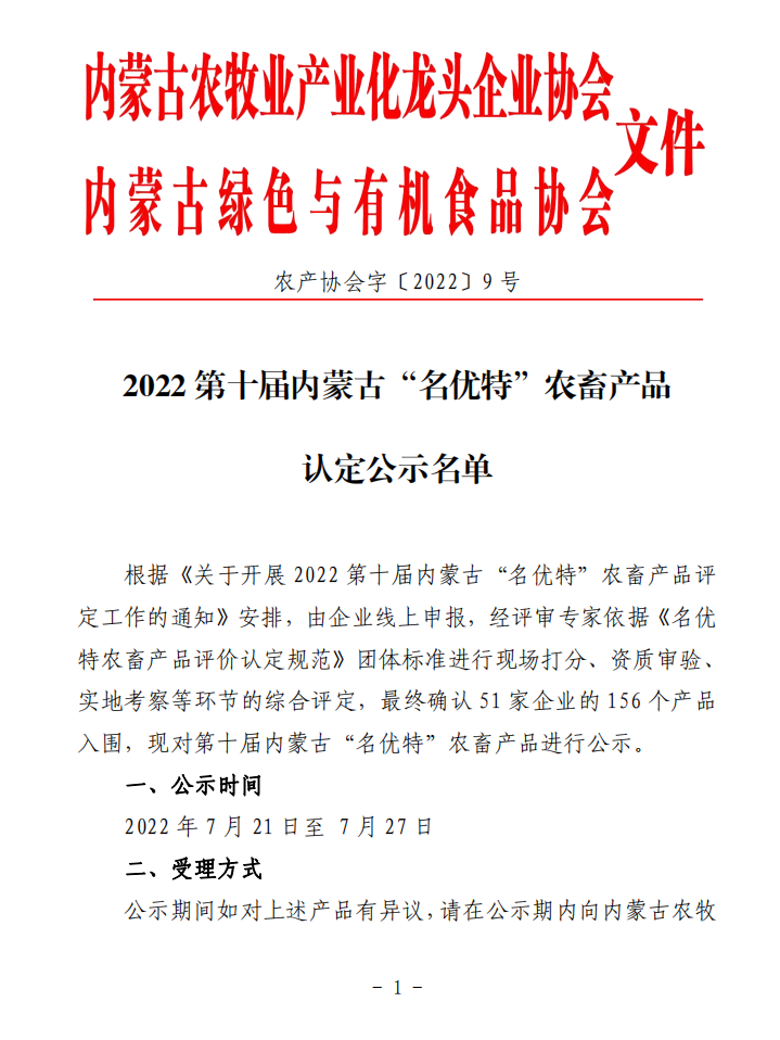 2022(第十屆)內蒙古“名優(yōu)特”農畜產品認定公示名單