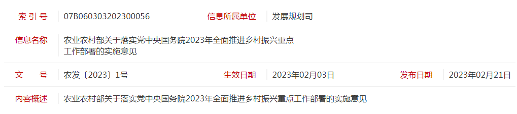 標(biāo)題:農(nóng)發(fā)〔2023〕1號(hào)農(nóng)業(yè)農(nóng)村部關(guān)于落實(shí)黨中央國務(wù)院2023年全面推進(jìn)鄉(xiāng)村振興重點(diǎn)工作部署的實(shí)施意見