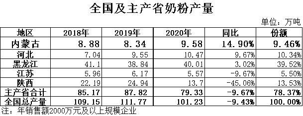 奶粉:根據(jù)國家統(tǒng)計局數(shù)據(jù),2020年全國奶粉產(chǎn)量101.23萬噸,同比下降9.43%,其中黑龍江產(chǎn)量40.01萬噸,同比增長3.02%,占總產(chǎn)量的39.52%,位居全國第一位;內(nèi)蒙古產(chǎn)量9.58萬噸,同比增長14.90%,占總產(chǎn)量的9.46%,位居全國第四位。