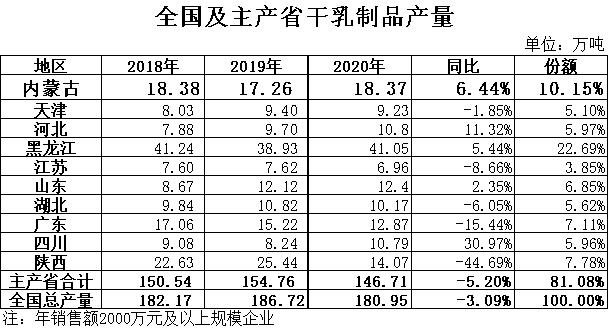干乳制品:根據(jù)國家統(tǒng)計局數(shù)據(jù),2020年全國干乳制品產(chǎn)量180.95萬噸,同比下降3.09%,其中12月份產(chǎn)量16.85萬噸,同比增長4.19%。其中黑龍江產(chǎn)量最高,41.05萬噸,同比增長5.44%,占全國總產(chǎn)量的22.69%位居全國第一位;內(nèi)蒙古產(chǎn)量19.37噸,同比增長6.44%,占全國總產(chǎn)量的10.15%,位居全國第二位。